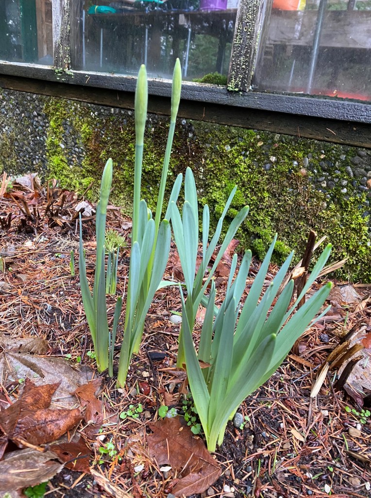 Because I want to “get there” to spring, I comfort myself with Camus’s often quoted  “In the midst of winter, I found there was, within me, an invincible summer.” I make a point of finding life within death in the natural landscape where I am walking.  Decades ago, someone logged the woods where I walk, leaving stumps to die.  But did they die? The stumps continue to decompose from which entwined, serpentine roots of a giant hemlock emerge.   So much for death! Those roots are like a Michelangelo sculpture.  Admiring it, I feel a spring in my step, all the way to the flower border by the greenhouse.  More decomposing leaves and windblown detritus from cedar and pines.  But there, as eagerly  as raised hands, emerge a row of daffodils.  “Oh my!”  I want to worry them back under the leaves, for winter isn’t over yet.  “Don’t jump the gun, young flowers. It is still mid-winter.”  Opposite that flower bed and behind a deer fence is my vegetable garden, frosty and fallow but showing off pink protruding noses of rhubarb.   Spring is undaunted and not far away. We will get there by the signs of the city limits.