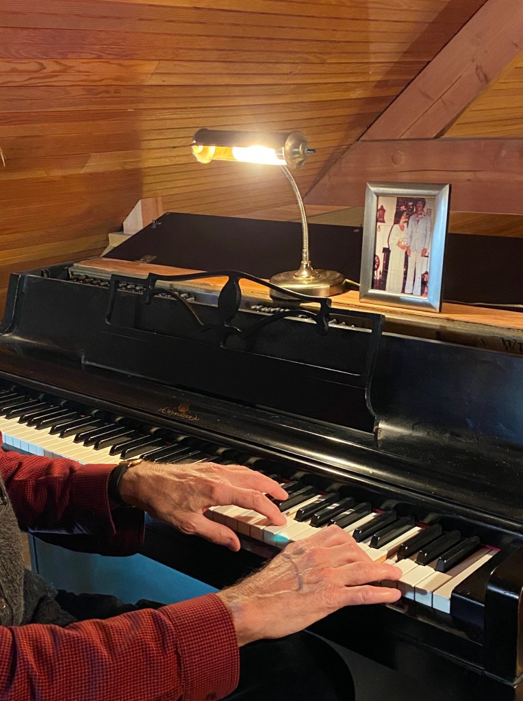 At this moment, my husband is acting as the piano tuner in the film.  He hits the same note repeatedly.  From the loft, my grandson’s voice: “Nice job, Grandpa.  That’s sweet!”