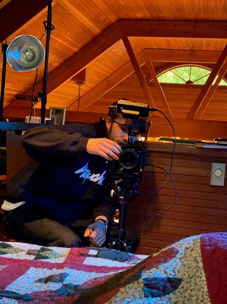 Within minutes of unpacking our weekend groceries, my grandson and my husband had fetched a ladder to ascend to the outside dormer window and drape a tarp over it to black out natural light from the loft bedroom where much of the film’s action occurs.  Chairs, tables, lamps have been moved to suggest separate rooms at distinct times of day and night.