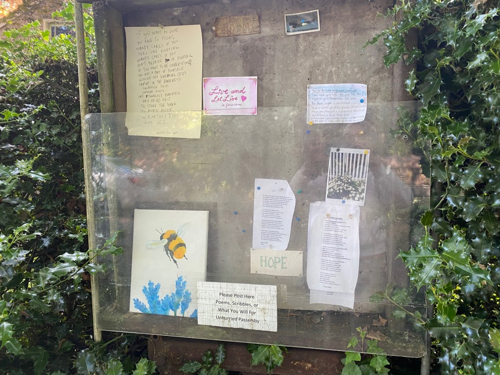 To a writer, there is something beseechingly abandoned about a blank surface inviting messages. I feel called to post a poem, much as a graffiti artist is summoned by a blank wall.  Now, a one-time inclination has morphed into an obsessive commitment.  For months, every Wednesday evening, in addition to practicing my piano piece for Thursday morning, I also write a poem to post on my way to or from my lesson.  With each posting, I would take down the poem from the prior week and toss it into the recycle bin always sitting on the parking strip.  That is, I did that UNTIL I met Paul walking out of his gate while I was pushing the fourth thumbtack on my new poem.  He thanked me for posting the poems but continued to scold me for taking them down.  That was HIS job. Besides, I sometimes removed them before he had a chance to read them.  Surely this man is unhurried. After his admonition, I left the poems in place until the entire board was wallpapered with poems by Mary Kollar.  Enough!  Today, I removed them all, stacking them like a deck of cards one on top of the other and returned them in one corner with one nail at the bottom of the board.  Only today’s poem remains dead center.