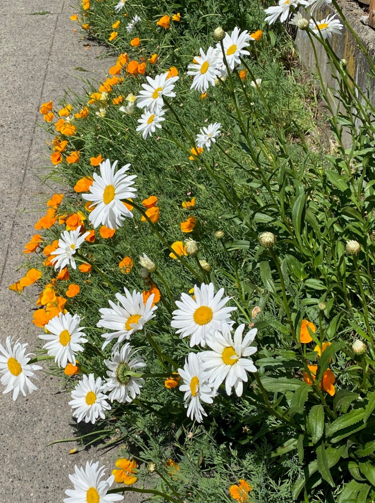 Continuing on up the steep hill, I passed a dense and colorful ribbon of orange California poppies mixed with tall daisies thriving in a narrow strip between sidewalk and property fence.  Two fat bumblebees worked away at the center of an orange flower.  I focused my I-phone camera on their buzzing, while thinking, “Who plants such a bevy of flowers OUTSIDE their backyard fence?  Only someone who wants to share with passersby, not to hoard beauty where only they could see them. “