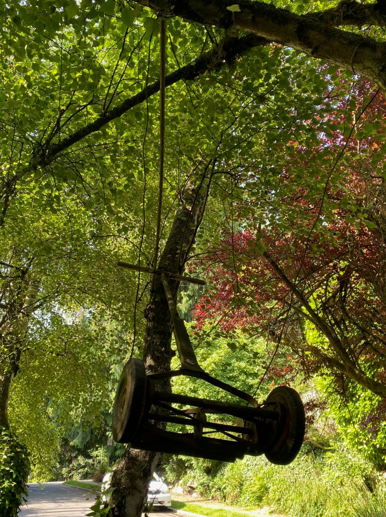 I have a little contest of wills with Paul.  Who is in a hurry to write, to read, to take down what is posted?  I am the one usually in a hurry, walking crisply up and down the hill, looking straight ahead or a short distance ahead so I don’t fall.  I must have walked beneath that hanging rusted bike and lawnmower for weeks before I noticed them.  Today, I decided to slow down, take longer to get home, enjoy the sun shining warmly on my shoulders – the unhurried passerby.  Up the steep hill home, I stopped for coffee that I sipped on a picnic table outside the Volunteer Park Café.  I wrote in my journal about the puffy haired spaniel leashed to the table where I sat.  I was alone and yet somehow with the other outside patrons and their dogs.