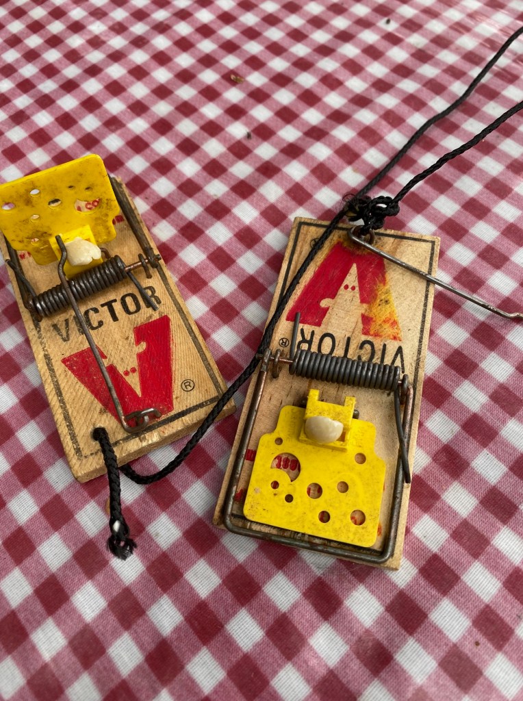 Allan fetched traps from the garage that he strategically placed in the kitchen, bedrooms, and two out-buildings (garage and studio). The very next day two mice bit the peanut, then bit the dust in the garage.  He set a larger rat trap in the closet by our bed, a small door within the closet opening to access plumbing and, by extension, the underflooring of our cottage set on stilts.