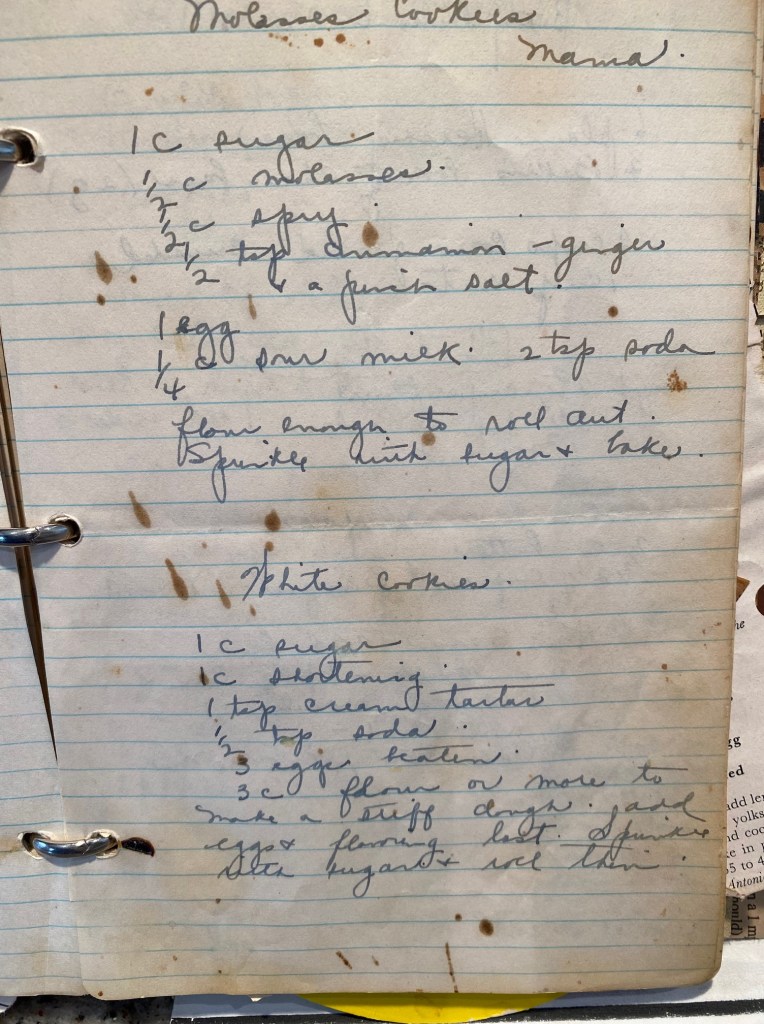 I still have my mother’s cookbooks on my kitchen shelf.  There in a scuffed three-ring notebook, my mother hand copied recipes from gelatin salads to tuna casseroles.  I rarely recreate one of those recipes, but I love reading them, all in my mother’s characteristic penmanship.  To see her handwriting is to see her.  Now that recipes are flashed by email, my daughter will not have a favorite dish described in her mother’s script.  But I do, and when I turned to the cookie section, there I found the recipe spotted with drips of what must be molasses.  (Favorite recipes all had splatters of ingredients on the pages).  In the upper right-hand corner, Mom wrote the name of the person who provided recipes –Mrs. Cooper, or Hilda Deck. On this cookie recipe I felt a solid connection with my mother and my grandmother for on the top right-hand corner, I see “Mama.”