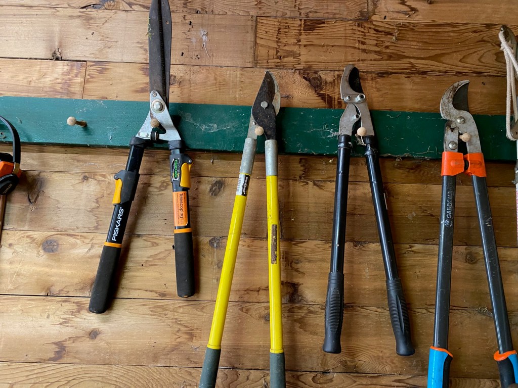 His dad’s lessons endure in the storage shed adjacent to the greenhouse where my husband has affixed wooden pegs in measured spaces one from the other to line up all sorts of gardening implements: hedge clippers, shovels, rakes, each in its place.  When my sister-in-law visited and spied what her brother had organized, she laughed out loud at the reincarnation of their father’s devotion to his tools.  Like father, like son, you might conclude, but surely no different than my daily use of a small cutting board once belonging to my mom.  Why have I not replaced it with a larger one?  You know why.