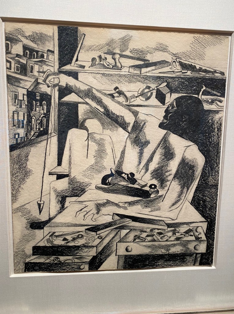 Tools are extensions of ourselves – the paintbrush to Monet, the baton to Leonard Bernstein.  Tools can be the measurement of our lives.  The artist, Jacob Lawrence, was not a builder, but his paintings and prints are full of tools — tools, hanging, tools overflowing in drawers.  We are fortunate to own a self-portrait Lawrence drew of himself in the later years of his life.  In the portrait, he sits before an open window in his Seattle studio surrounded by tools.  In his hand he holds a plumb line up to the window while looking over his shoulder at Harlem from which he came.  A plumb line is an essential tool for a builder because it works with gravity to assure things are aligned.  Is Jacob Lawrence reflecting on the journey of his life, looking back to see if his course has been true?  As a symbol of measurement, the plumb line occurs more than once in the Bible.  In the book of Amos, the Lord explains his judgement to Amos: “I am setting a plumb line among my people Israel: I will spare them no longer.” (Amos 7: 7-8)