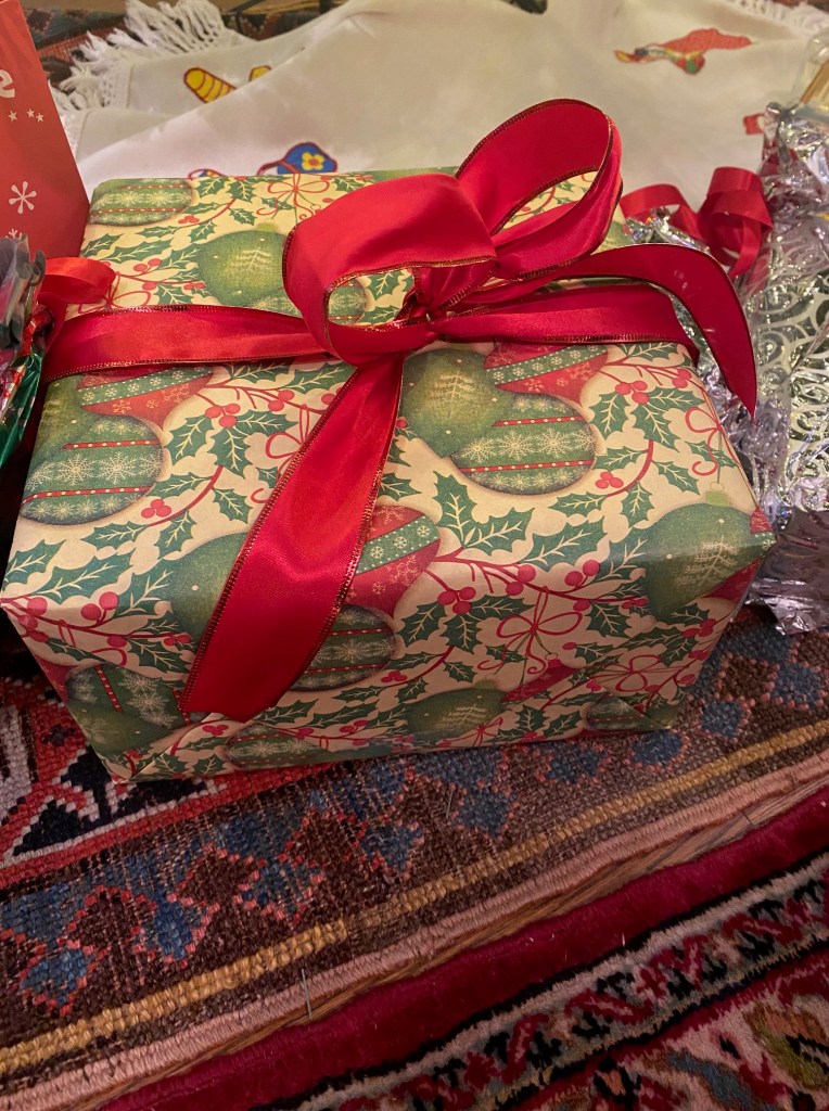 Each fall, when relatives ask what we would like for Christmas, we say, “We don’t need a thing,” and that is true.  I imagine one more kitchen device I have no room to store, and I beg off with “Let’s just send consumables this year.”  I make raspberry jam to send and await my sister-in-law’s Ukrainian cookies.  One step from there is “Let’s just do cards this year.”  Both sides agree.  Then a week before Christmas, a beautifully wrapped box arrives from my brother and sister-in-law with a card that reads. “a gift for the cook.”