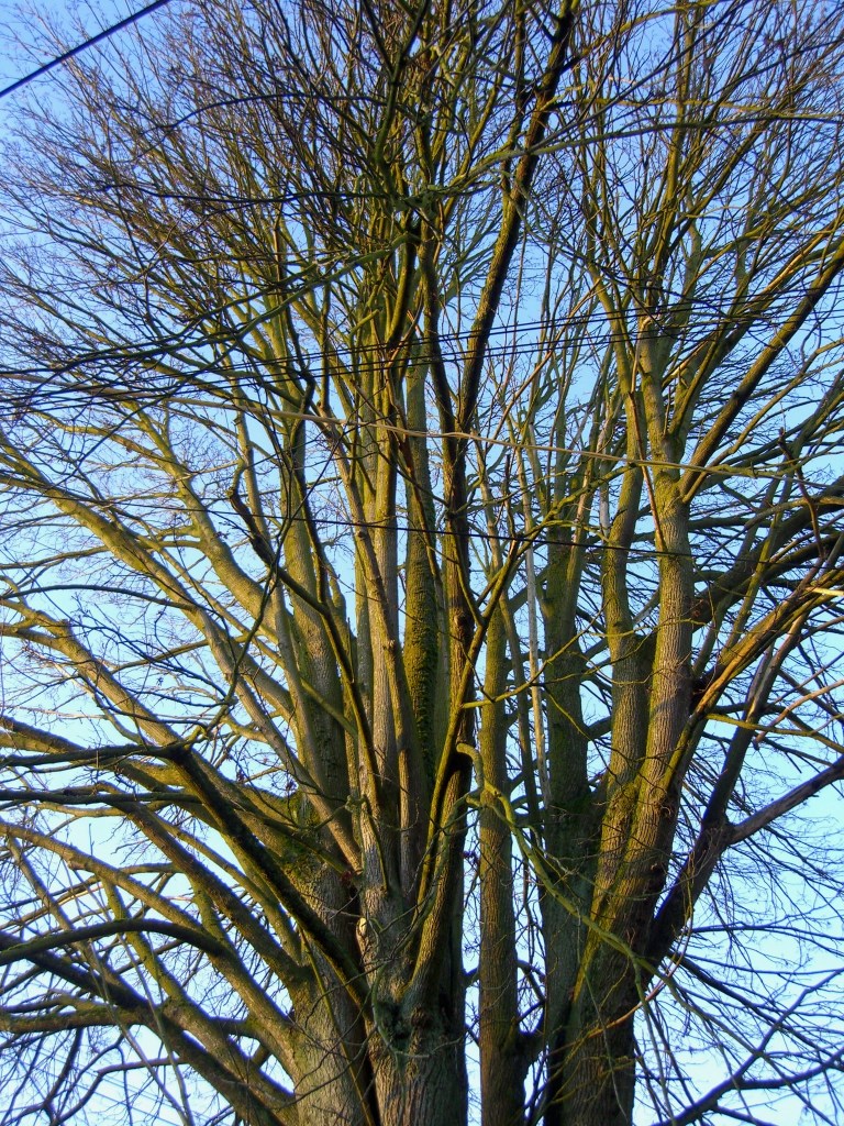 Walking in January, I praise what is absent.  Usually lined with sweet gum trees — a canopy of broad green leaves in summer, large golden leaves in autumn–in January not a stubborn leaf remains on a tree.   It is as if this part of Capitol Hill did a thorough house cleaning, stripping each tree, but for the brownish gray branches.  They reach outwards and upwards, a tangle of geometric limbs, reminding me of Nature’s architecture.  Each limb seems to have purpose as a balance for another on the other side, or an extension from which thinner branches reach out like tendrils to the sun.  Rather than admire a shower of leaves, I note the rounded burls up the trunk, like moss-covered hats.  Thick moss paints itself between heavy limbs that decided to make their own way from a massive trunk.  On this twenty-seven-degree day, surely insects must snuggle in the soft moss.  Grateful for the absence of leaves, I see high in some trees, baskets of crazily assembled twigs and grasses.  Perhaps they are nests for squirrels cleverly camouflaged in other seasons, but out there now vulnerable to winter’s wind.