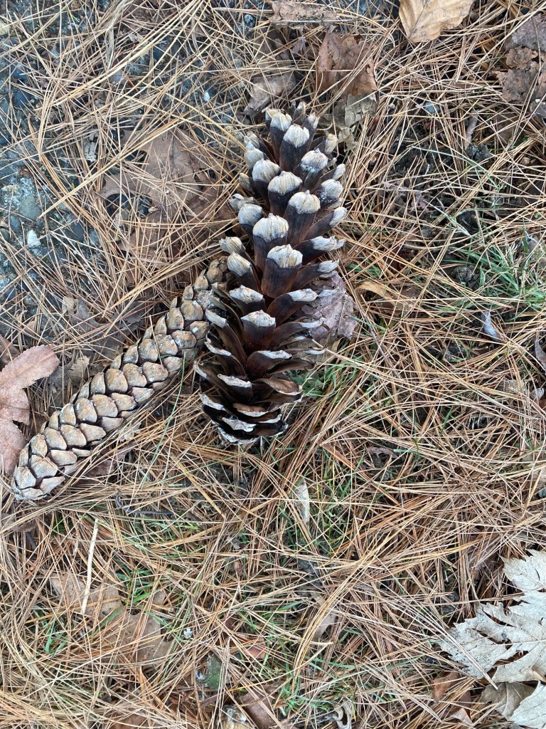 Granted this is a sunny day, uncommon in the Pacific Northwest winter, so sun and shadows grab my attention.  But rain or shine, there is interesting stuff dropped on parking strips and sidewalks.  A gigantic pine tree on the corner drops pinecones as large as ten inches long and three inches wide.  They lie atop a bed of thin dry needles.  Surely they would be a treasure if I imagined a creative use for them.  A friend celebrated Christmas by gathering large cones and stuffing them with suet and peanut butter, then hanging the cones around a park adjacent to her home.  She said her project was her gift to the many birds that winter-over in the woods.