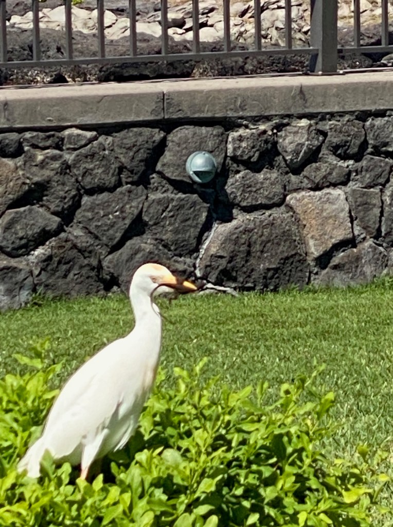 On my walk, white wings flew into sight – a graceful egret lit on an adjacent shrub.  it paced as gracefully as a back-home heron walks on tidal flats.  I stopped walking to examine its movement.  A wave-like thing itself, the bird seemed to flick forward then back, its body undulating in grace.  Until it stopped, a sudden arrest, its beak thrust into the hedge and returned erect again, a small gecko its flailing victim.  Yes, everything must eat.  Nonetheless, I had two awesome sightings in a day, and one ate the other!