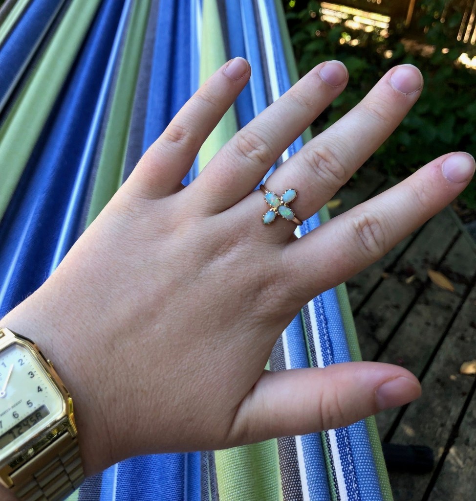 For her graduation, I gave my granddaughter an opal ring, first made as one of a pair of earrings my father brought my mother from India where he served in WW II. My mother lost one, and, after her death, I found the other in her small jewelry box. I saw in the soft blue stones exotic India and my absent father. I made a ring of the opals. My granddaughter will not see in the stones New Delhi nor my father. Now, in a ring on my granddaughter’s hand she will find me.